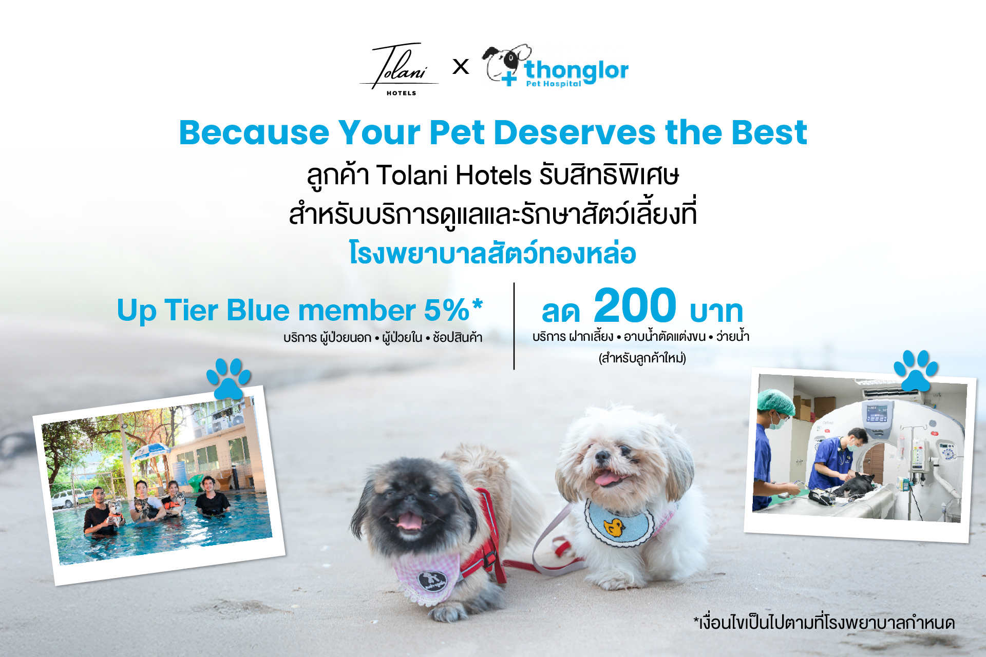 ยกระดับการพักผ่อนของคุณและสัตว์เลี้ยงแสนรัก ด้วยสิทธิพิเศษจากความร่วมมือระหว่าง Tolani Hotels และโรงพยาบาลสัตว์ทองหล่อ โรงพยาบาลสัตว์ชั้นนำที่พร้อมดูแลสุขภาพและความเป็นอยู่ของน้อง ๆ อย่างมืออาชีพ