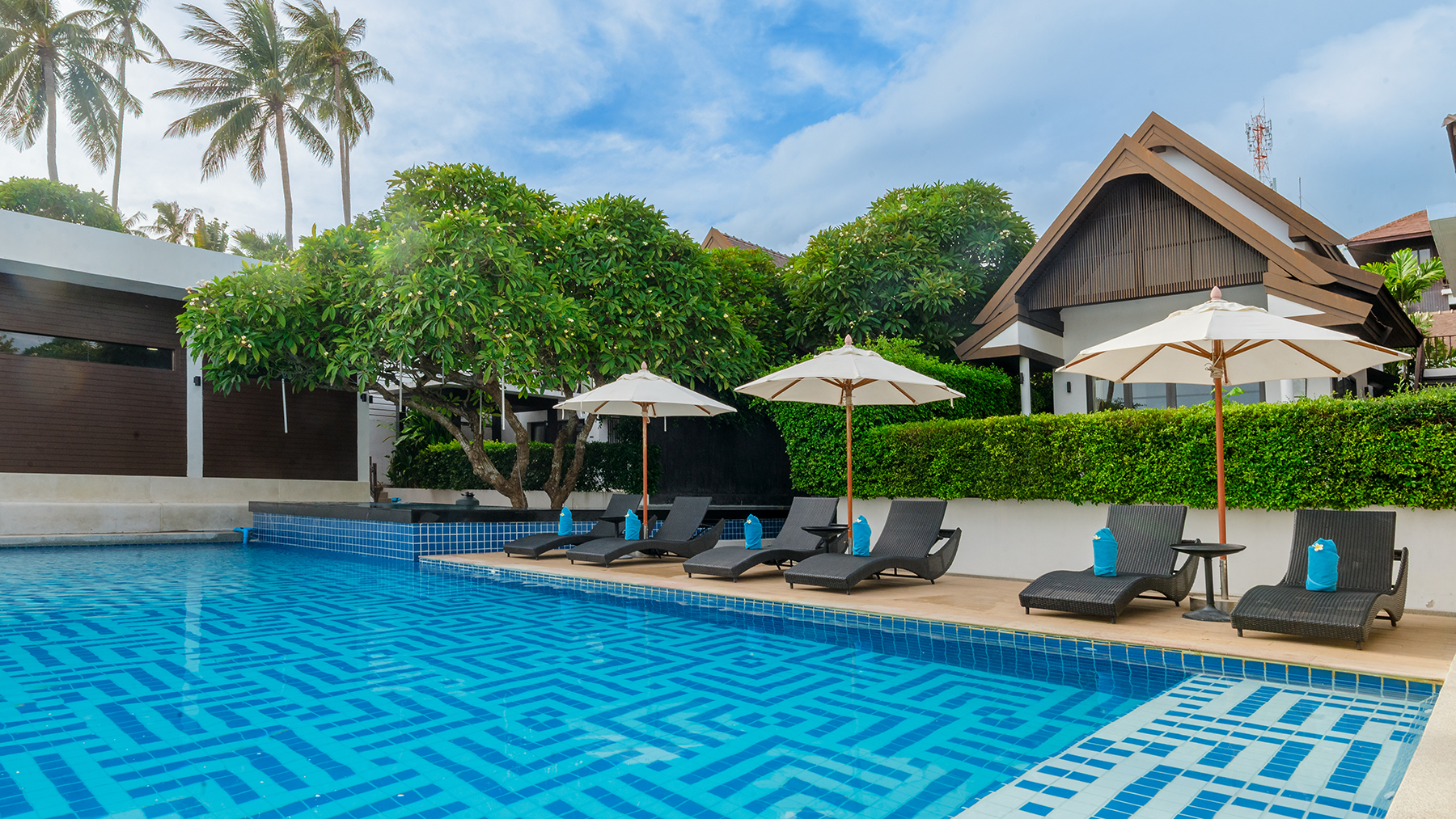 ทรายบริสุทธิ์ทางด้านซ้าย ชีวิตที่หรูหราทางด้านขวา ตรงกลางมีสระน้ำส่องแสงระยิบระยับ ว่ายน้ำในสระว่ายน้ำริมชายหาดที่มีแสงแดดอุ่น จิบค็อกเทลผลไม้สด และเพลิดเพลินไปกับความหรูหราของเดอะซี เกาะสมุย รีสอร์ท แอนด์ เรสซิเดนซ์ บาย ทูลานี