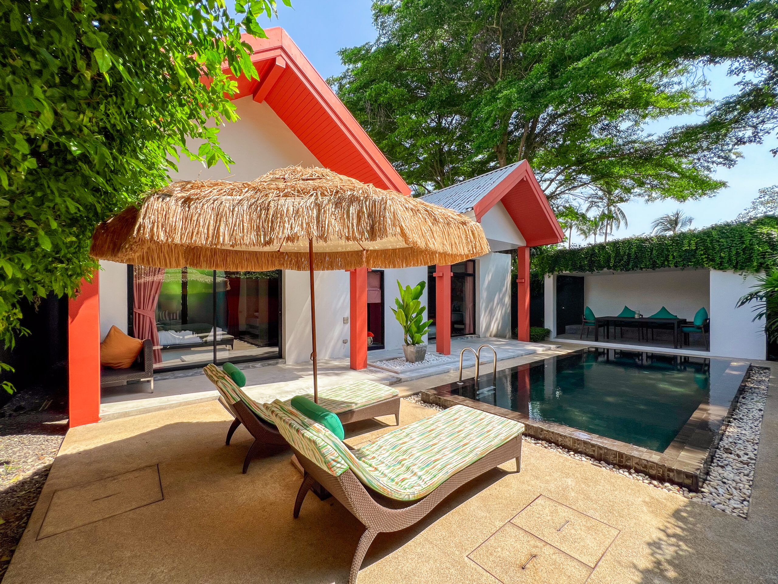 Family Pool Villa แบบเปิดโล่งมีเตียงคู่ขนาดใหญ่ สามารถรองรับผู้เข้าพักได้ถึง 4 ท่านอย่างสะดวกสบาย มีระเบียงส่วนตัว สวน สระว่ายน้ำ เก้าอี้อาบแดด และความบันเทิงล้ำสมัย ระบบที่มีไลบรารีสื่อ