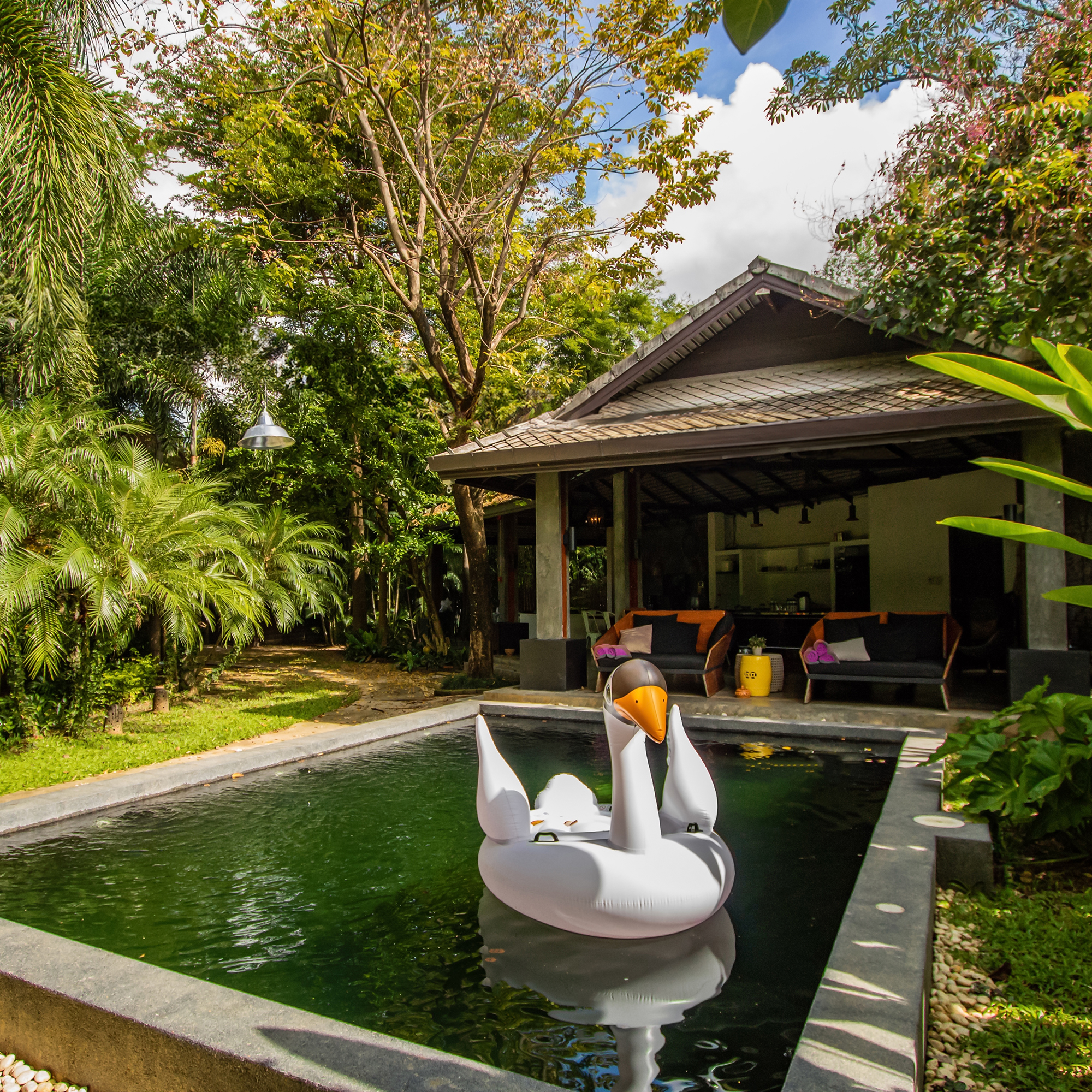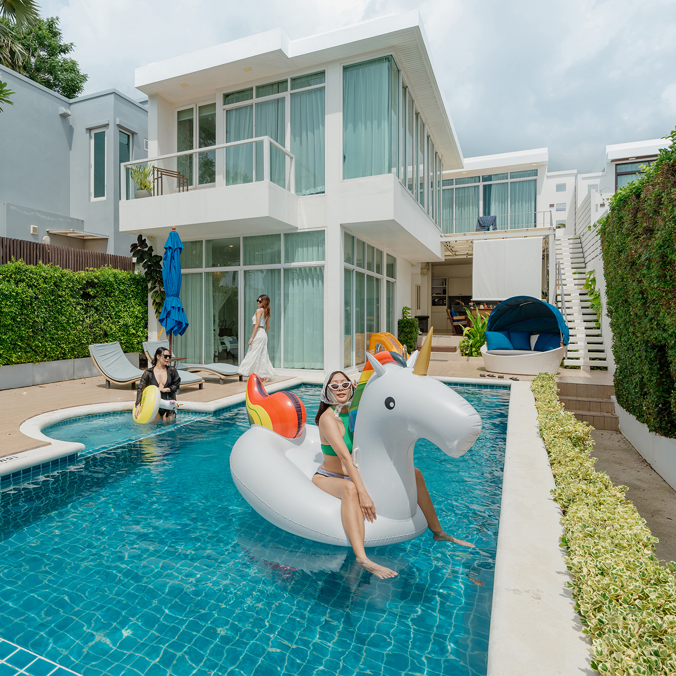 วิลล่าแห่งนี้เปรียบเสมือนโอเอซิสวิลล่าขนาดเล็กในใจกลางเมือง ประกอบด้วยวิลล่า ขนาดเล็ก 3 หลังแยกจากกัน โดยแต่ละหลังมีห้องนอน 2 ห้อง ห้องครัวขนาดกะทัดรัด โต๊ะรับประทานอาหาร พื้นที่นั่งเล่นและระเบียงส่วนตัว มอบความเป็นส่วนตัวควบคู่กับความสะดวกสบายอย่างลงตัว พื้นที่ส่วนกลางกลางแจ้งขนาดใหญ่ ถูกออกแบบมาเพื่อการใช้เวลาร่วมกันอย่างผ่อนคลายและสนุกสนาน ไม่ว่าจะเป็นการรับประทานอาหาร ทำอาหารร่วมกัน เล่นบิลเลียด หรือพักผ่อนริมสระว่ายน้ำที่โอบล้อมด้วยธรรมชาติและสระน้ำส่วนกลางขนาดใหญ่ ช่วยสร้างบรรยากาศแห่งการพักผ่อนในสไตล์เอเชียที่ไม่เหมือนใคร เหมาะสำหรับกลุ่มเพื่อนหรือครอบครัวที่มองหาประสบการณ์การเข้าพักที่เป็นส่วนตัว สงบ และเต็มไปด้วยเสน่ห์เฉพาะตัว