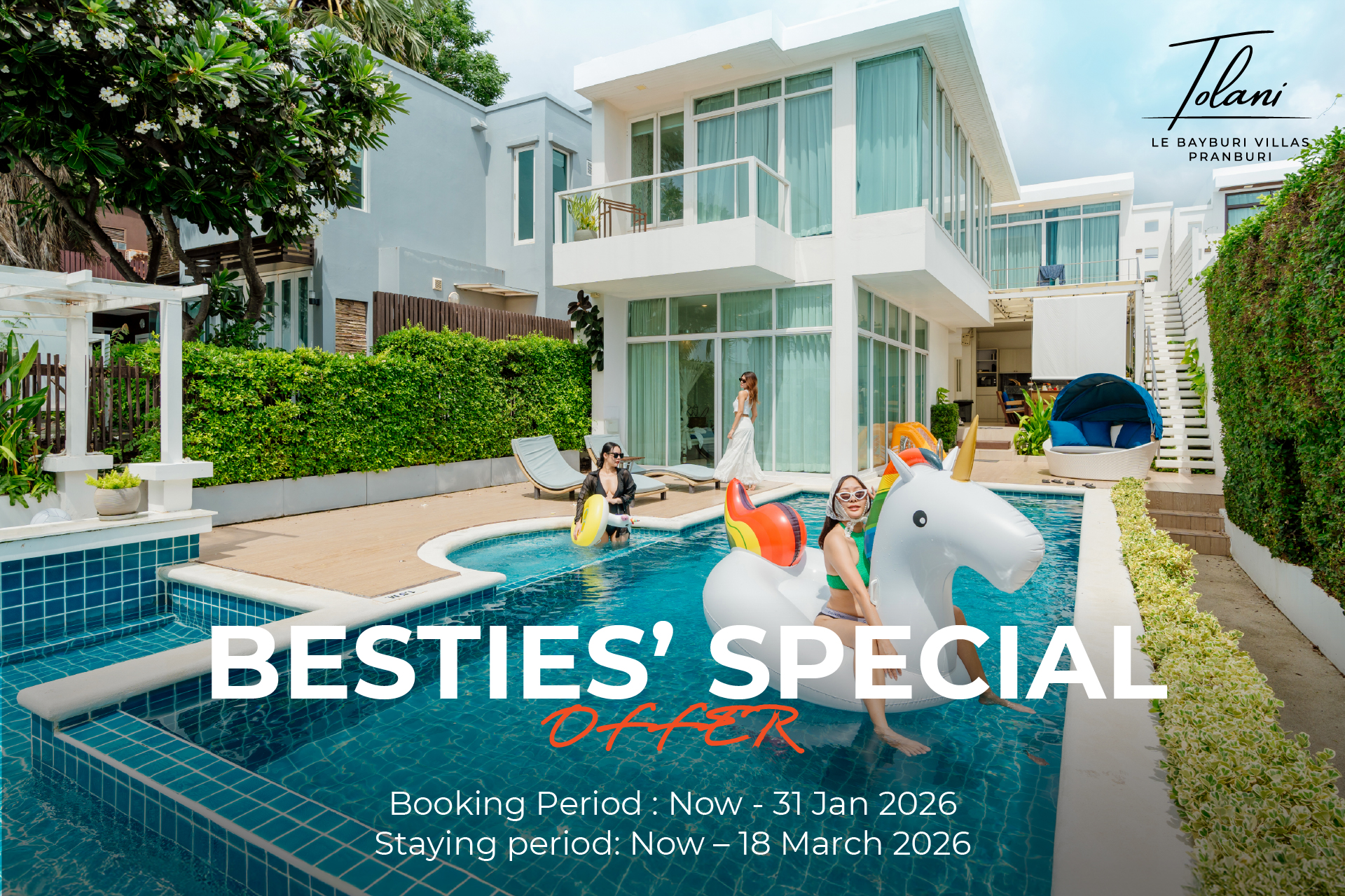 Turn your next getaway into a shared escape at Tolani Le Bayburi Villas Pranburi with our Besties’ Special Offer, thoughtfully designed for friends, families, and furry companions.