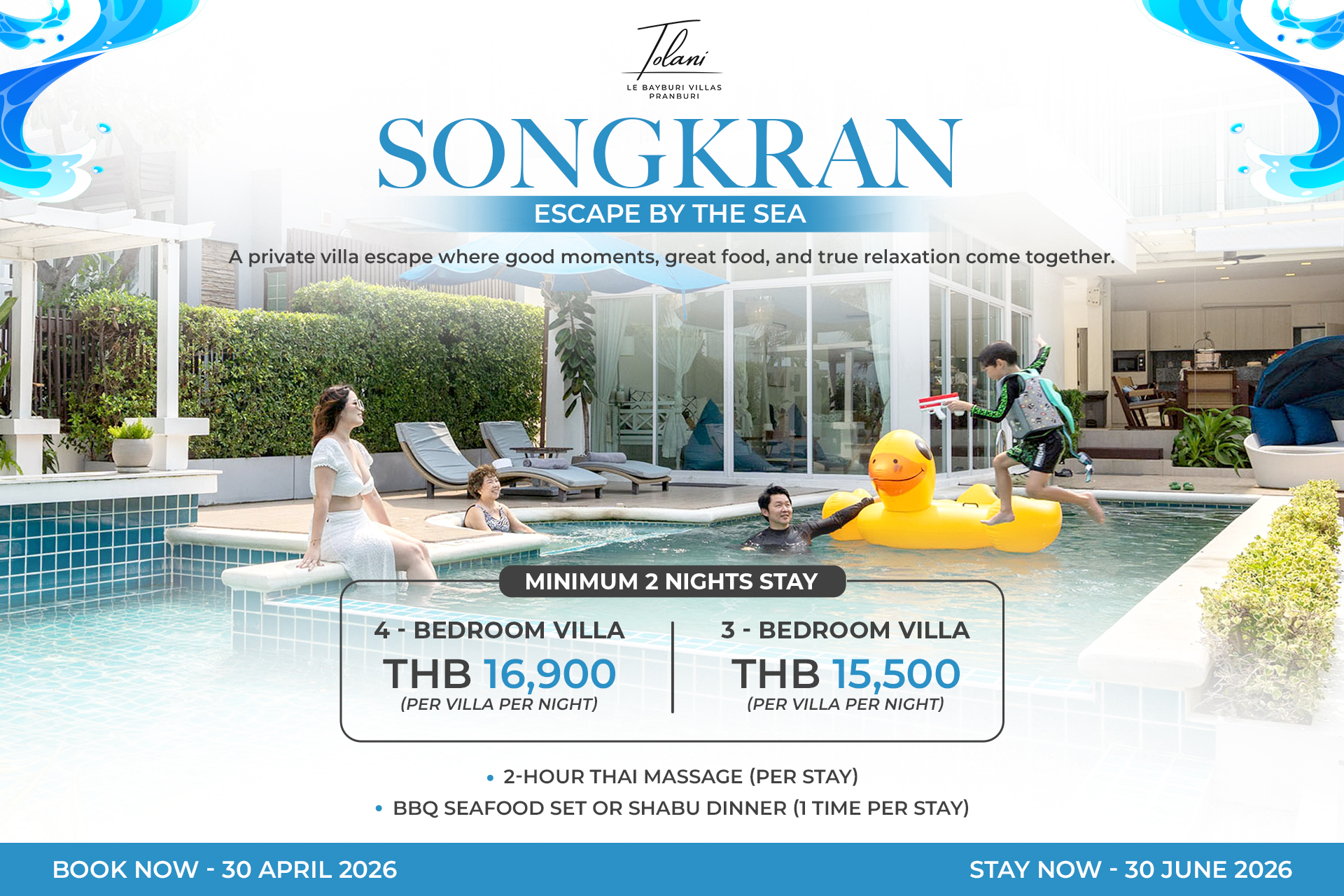 Celebrate Songkran with a private villa escape by the sea at Tolani Le Bayburi Villas Pranburi, surrounded by cherished family moments, delightful flavors, and effortless relaxation. Spend meaningful time together in a spacious villa designed for comfort and privacy, complemented by special dining experiences and moments of calm by the ocean.